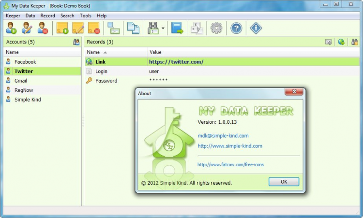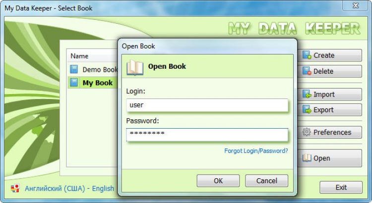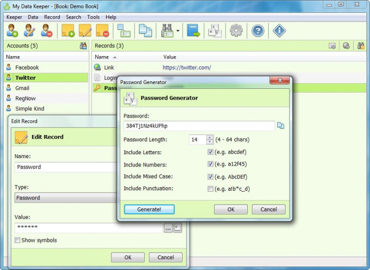 Вы сможете создать учетные записи (книги), в которых будете хранить различную информацию. Книги являются переносным контейнером, вы сможете работать с одной и той же книгой на разных компьютерах. Также, благодаря встроенному генератору паролей, вы можете сгенерировать пароли, которые невозможно подобрать.