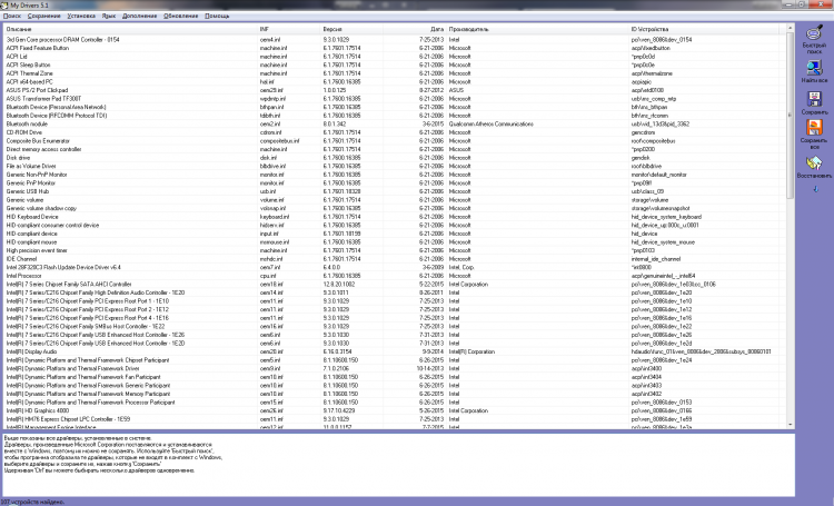 My Drivers сканирует ваш компьютер в поисках подключенных устройств и проверяет их драйвера. Если драйвер отсутствует, она найдет и установит его. Если он устарел - обновит его. Так же бывают случаи, когда новый драйвер, в силу разных причин, нарушает корректную работу устройства или всей системы. В этом случае программа откатит драйвер до предыдущей версии, восстановив работоспособность вашего компьютера. Еще эта программа умеет сохранять установленные драйвера на диск, и восстанавливать их.