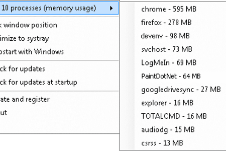 My Memory Monitor - это программа, которая добавляет на рабочий стол маленький индикатор, показывающий объем занятой и свободной оперативной памяти. Она также добавляет свою иконку в системный трей. Кликнув по иконке My Memory Monitor в трее можно вызвать меню, в котором собраны настройки программы, а также увидеть самые "прожорливые" процессы.