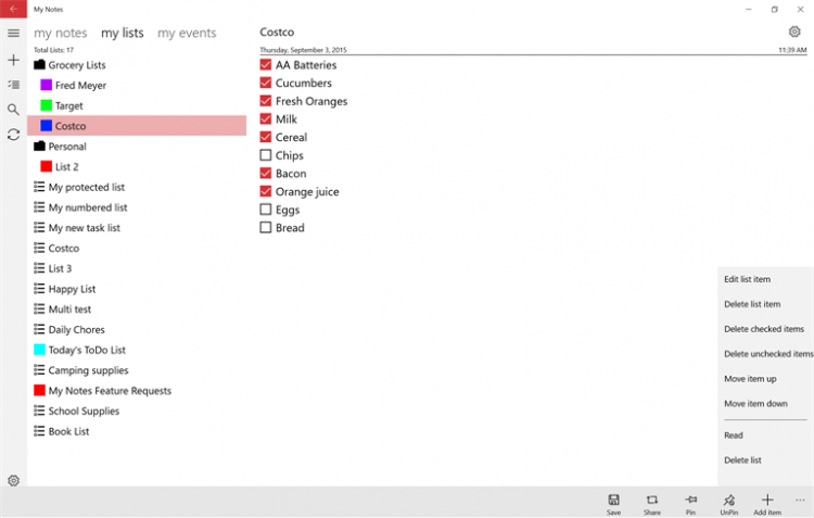 My Notes - это программа, которая предлагает быстрый и удобный способ создания и хранения заметок на компьютере. Она проста в использовании и имеет понятный интерфейс, в котором не нужно рыться в недрах меню в поисках нужной функции. Программа позволяет упорядочить заметки с помощью категорий. Плюс, при создании новой заметки выбирается цветовой маркер, который поможет лучше каталогизировать их по типу или важности. Кроме этого, программа отдельно показывает текстовые заметки, списки (дел, покупок и пр.) и запланированные события/дела.