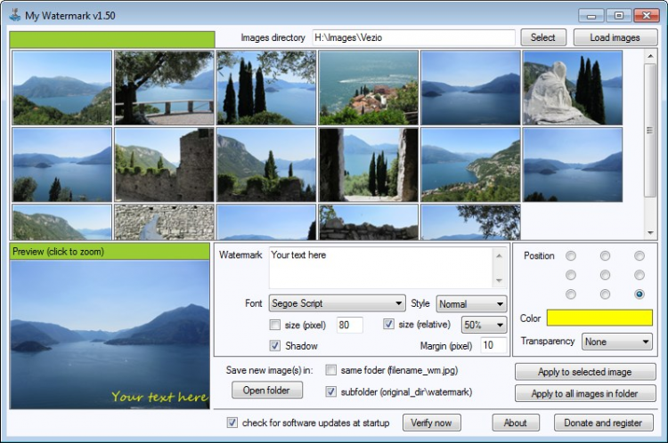 My Watermark - это программа, которая позволяет добавлять текстовые водяные знаки на изображения в пакетном режиме. Вы можете выбрать положение знака на изображении, применить к нему эффекты (тень, контур, прозрачность), а My Watermark сама подберет нужный размер текста, в зависимости от размера изображения.