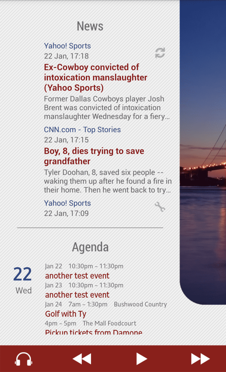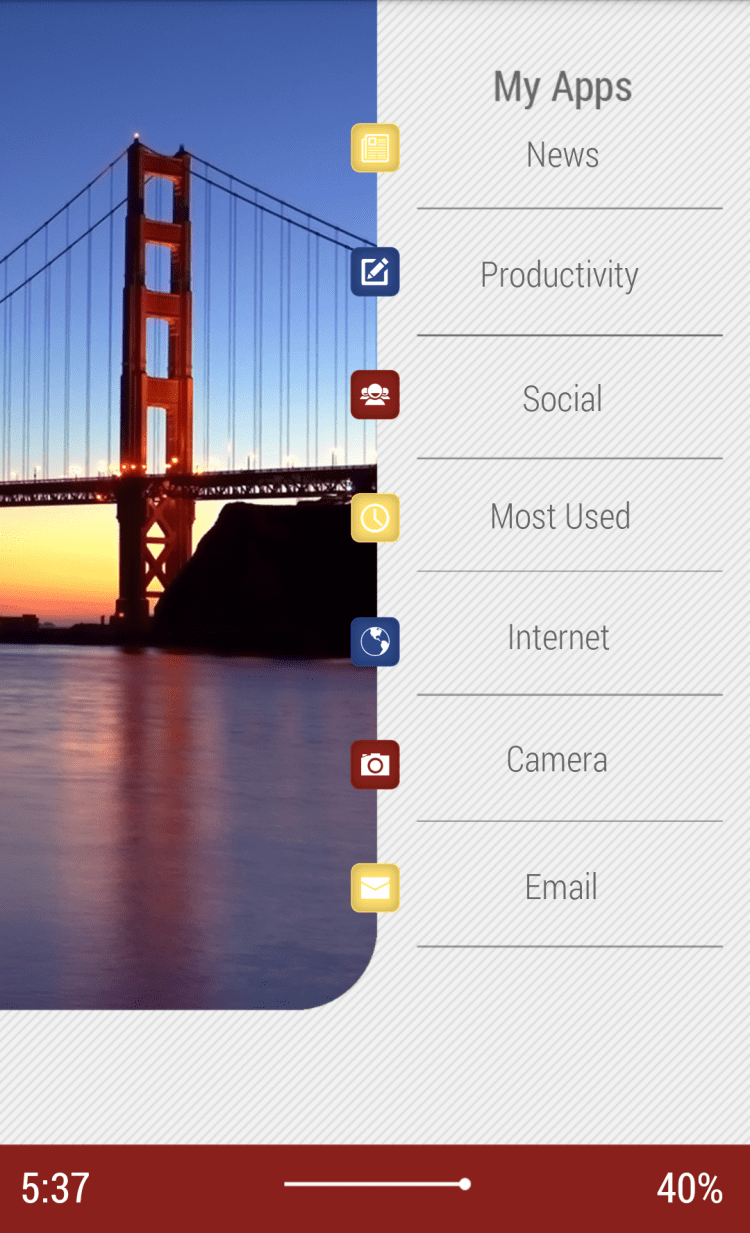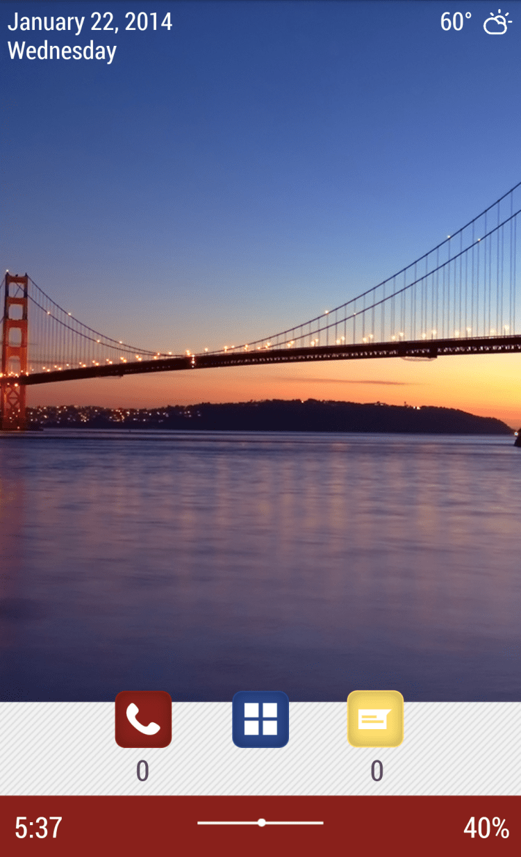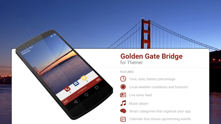 Golden Gate Bridge Theme Эта программа позволит вам просматривать информацию о дате, времени, состоянии батареи и событиях календаря прямо на рабочем столе своего устройства. Программа обладает красивыми обоями с изображением моста Голден Гейт. Благодаря этой программе, вы сможете просматривать список пропущенных звонков, СМС и письма электронной почты, управлять воспроизведением в проигрывателе, а так же категоризировать приложения при помощи умных папок.