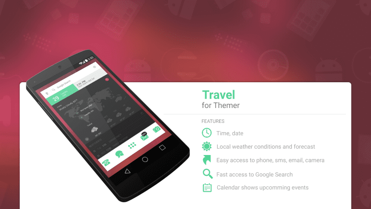 Travel Theme Эта программа позволит вам просматривать информацию о дате, времени, состоянии батареи и событиях календаря прямо на рабочем столе своего устройства. Программа обладает красивыми обоями с картой мира. Благодаря этой программе, вы сможете просматривать список пропущенных звонков, СМС и письма электронной почты, управлять воспроизведением в проигрывателе, а так же получить быстрый доступ к поиску Google.