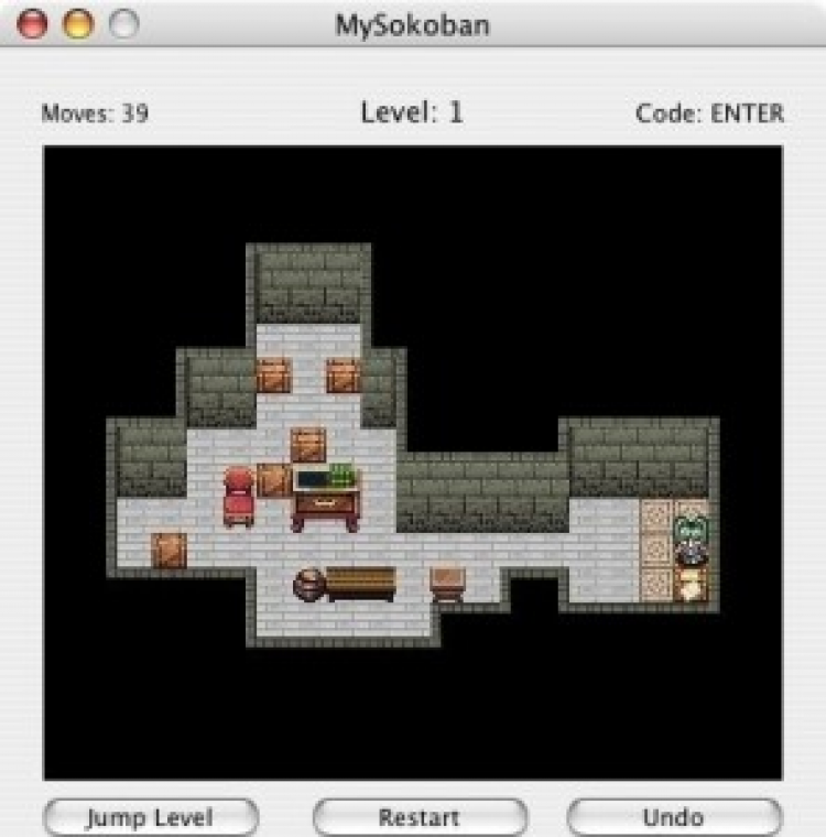 MySokoban Разновидность знаменитой головоломки Sokoban. В этой игре игроку предстоит раставлять ящики в комнатах, набитых мебелью и другими предметами. Графика выполнена в пиксельном стиле.