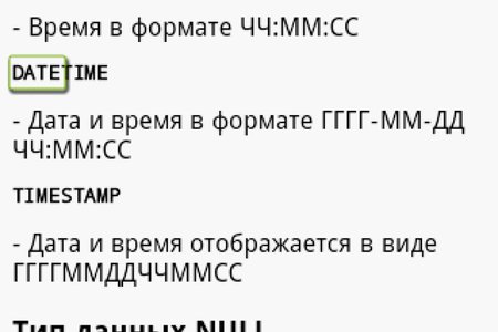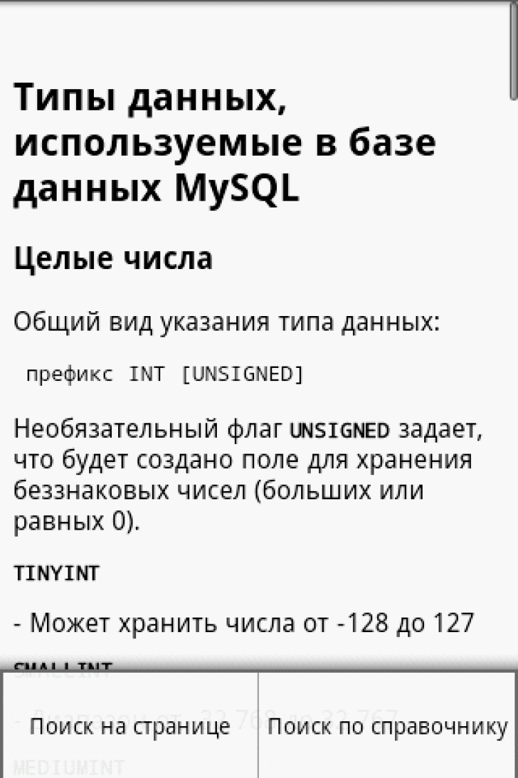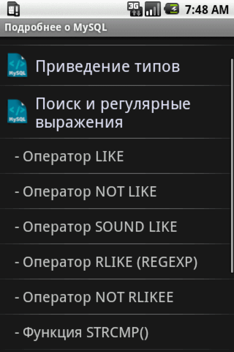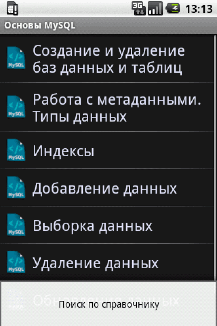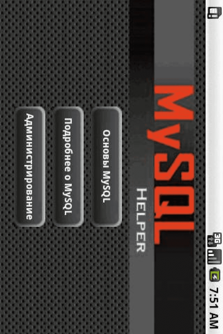 MySQL Helper Данное приложение предназначено для всех, кому необходим быстрый доступ к основам MySQL. MySQLHelper - справочник по структурированному языку запросов MySQL в вашем Android смартфоне с удобной навигацией по темам и множеством примеров. MySQLHelper не требуется интернет для загрузки информации по темам, все внутри него, что позволяет экономить интернет-траффик, а также пользоваться программой при отсутствии сетей.