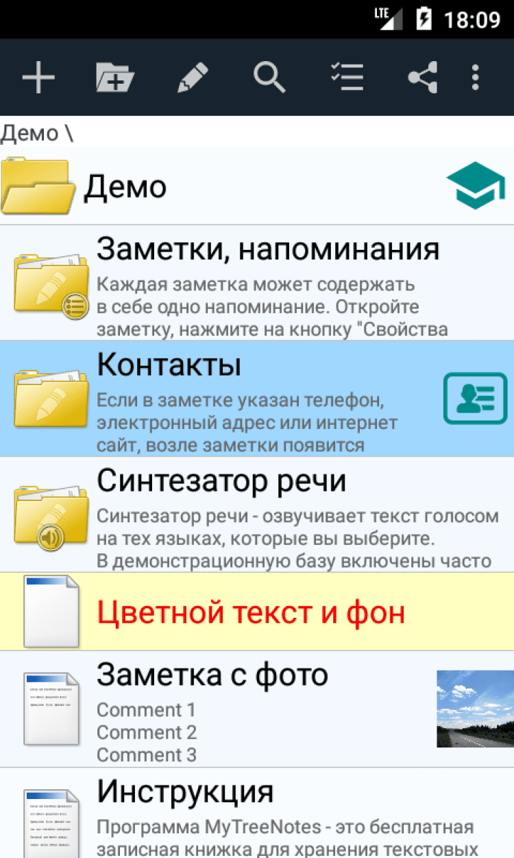MyTreeNotes - Древовидная записная книжка Заметки в записной книжке "MyTreeNotes" хранятся в виде дерева с неограниченной вложенностью, это позволяет разложить все заметки по темам так, как вам это удобно.