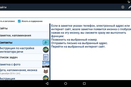 - возможность из заметки набрать телефонный номер, отправить e-mail или открыть Web сайт;