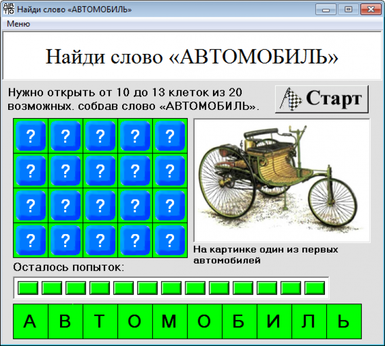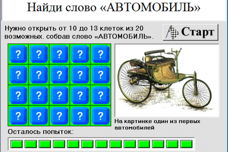 Найди слово «АВТОМОБИЛЬ» - это игра для проверки интуиции, нужно открыть от 10 до 13 клеток из 20 возможных, собрав слово «АВТОМОБИЛЬ».