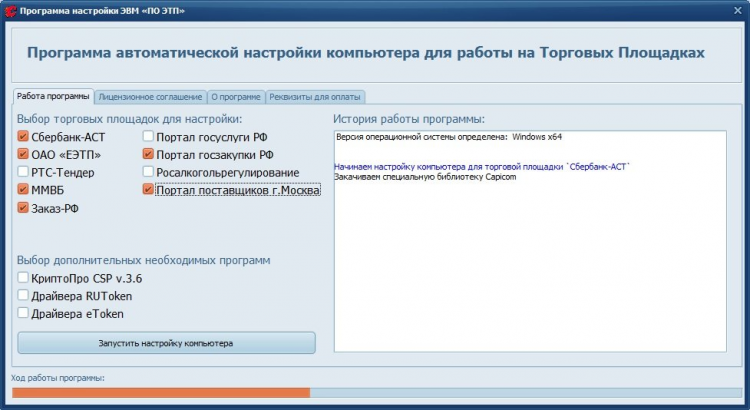 Данная программа одинаково подходит как Поставщикам так и Заказчикам. При запуске программа автоматически определяет разрядность (х32 или x64) операционной системы и самостоятельно устанавливает и прописывает необходимые библиотеки CAPICOM. Так же производится выбор компонентов (КриптоПро и драйверы носителя) с учетом разрядности операционной системы.