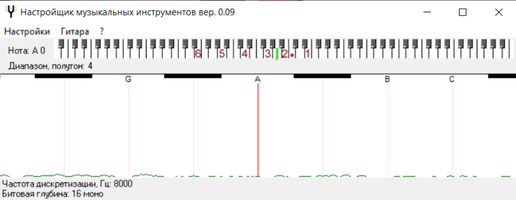 Настройщик музыкальных инструментов - это программа записывает звук с инструмента и по этому звуку рисует спектр. Вращением колков нужно совместить спектр с красной меткой. Естественно инструмент нужно подключить к компьютеру. Если у гитары есть звукосниматель, то можно напрямую в линейный вход звуковой платы, с микрофона тоже хорошо получается. Точность: не хуже 1/20 полутона.