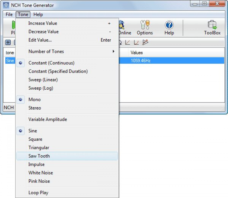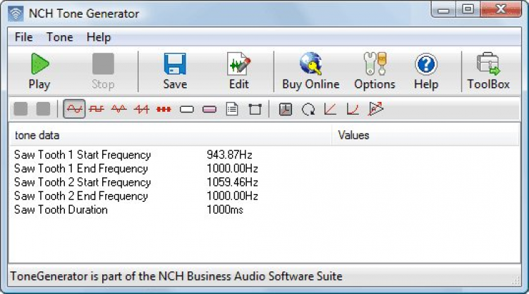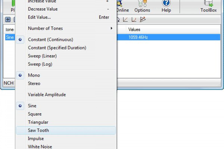 NCH Tone Generator умеет генерировать синусоидальные волны, создавать меандр, треугольную форму волны, пилообразный сигнал, импульсные волны, а также шумы различных цветов. Ширина полосы пропускания составляет от 1 Гц до 22 кГц. Сгенерированные сигналы можно сохранять в WAV формате.