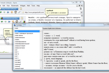 NeoDic - это словарь с контекстным переводом. Контекстный перевод позволяет путем простого наведения курсора мыши на незнакомое слово либо словосочетание, мгновенно получить его перевод. Данный тип перевода очень удобен при чтении страниц Интернет, чтении справочной системы, общении в чате, верстке текста.