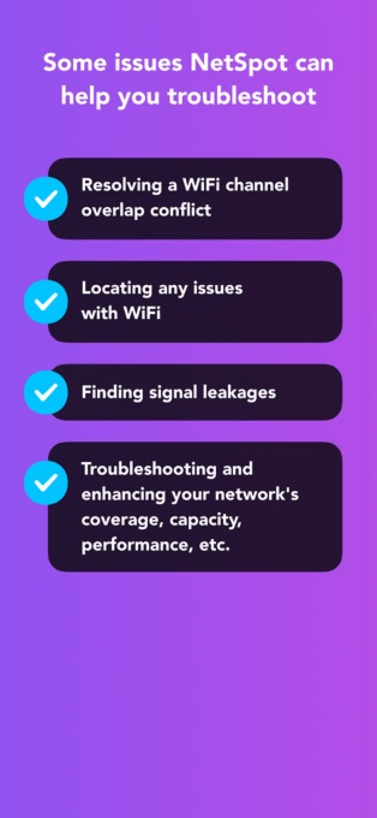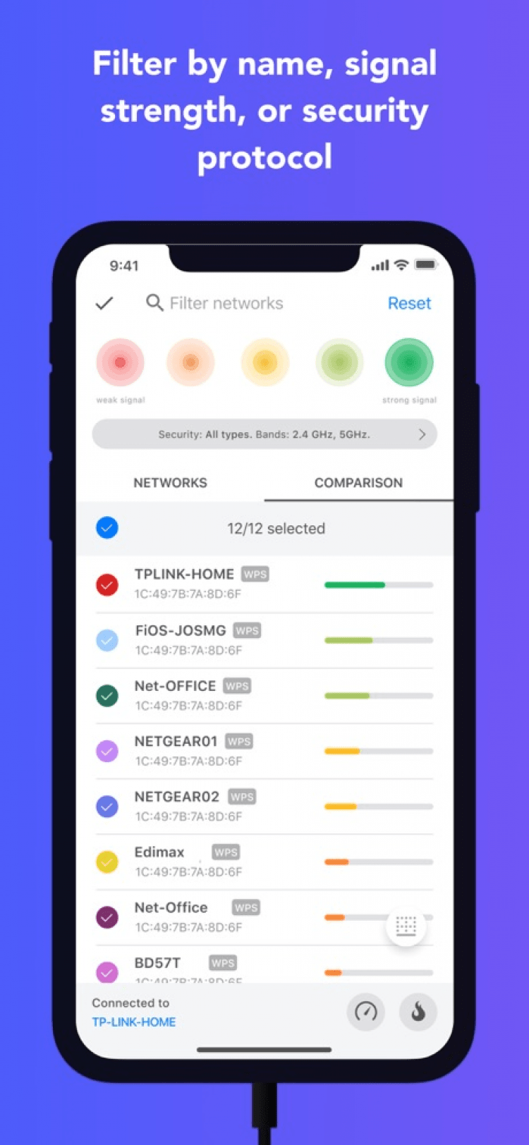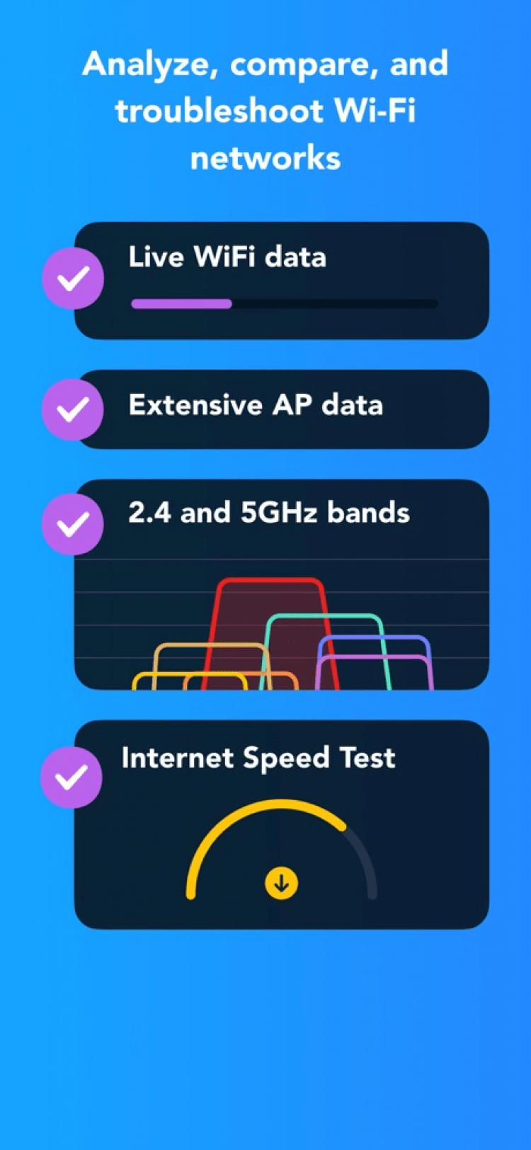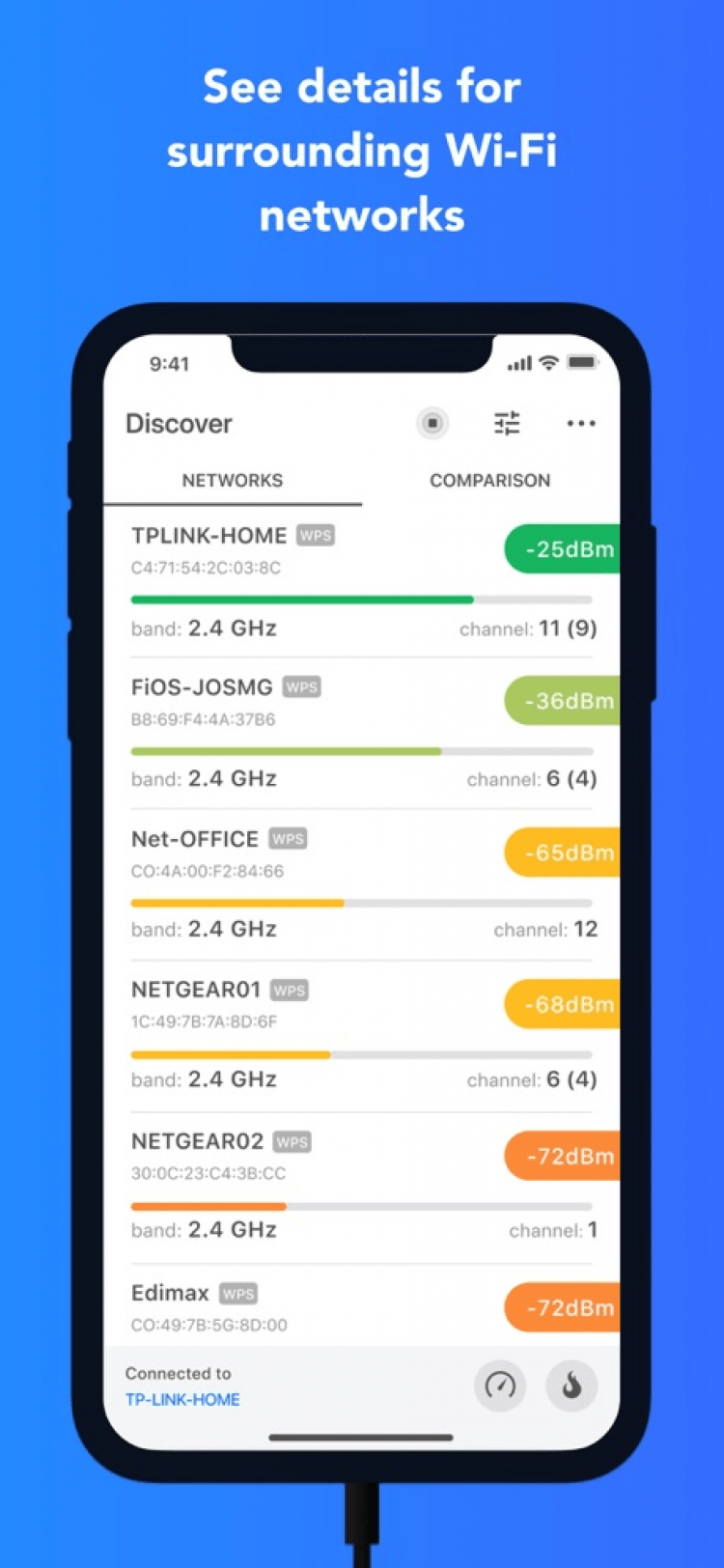NetSpot - Wi-Fi Analyzer — программа, которая позволит вам проанализировать сети Wi-Fi, окружающие вас, прямо на своём мобильном телефоне. Последняя версия приложения позволяет просматривать в реальном времени список доступных сетей, их названия, канал, мощность сигнала, частоту, а также другие данные. Таким образом, программа поможет вам в настройке сети и избежать наложения частот дома или в офисе.