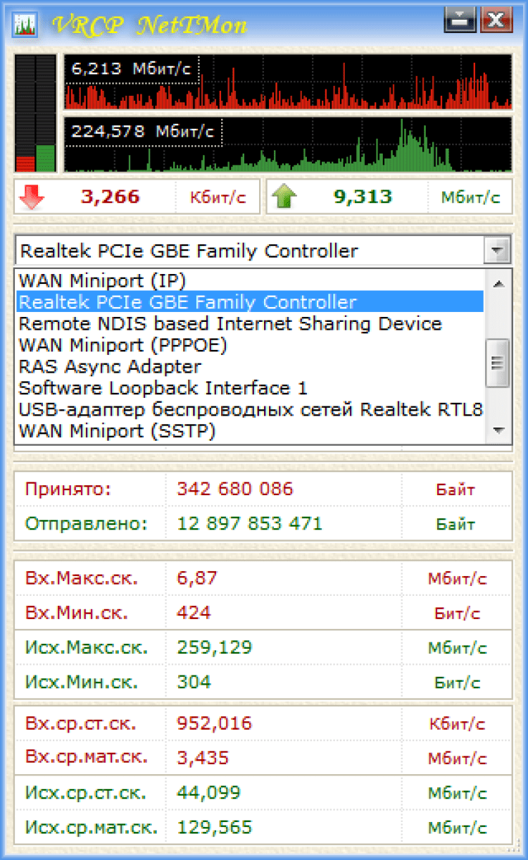 NetTMon - это утилита предназначена для визуального мониторинга (контроля) сетевого трафика со всех имеющихся в системе сетевых интерфейсов (устройств), а также предоставления основной статистической информации о передаваемых через них данных. Отображает текущую, максимальную, минимальную и среднюю входящую и исходящую скорость передачи данных.