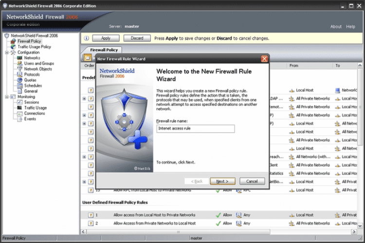 NetworkShield Firewall - это корпоративным межсетевым экраном нового поколения для обеспечения доступа к Интернет, защиты сетей и точного учета трафика пользователей. Программа работает под управлением Windows 2000/XP/2003. NetworkShield Firewall специально разработан для использования в сложных сетях, там где требуется повышенная надежность и управляемость.