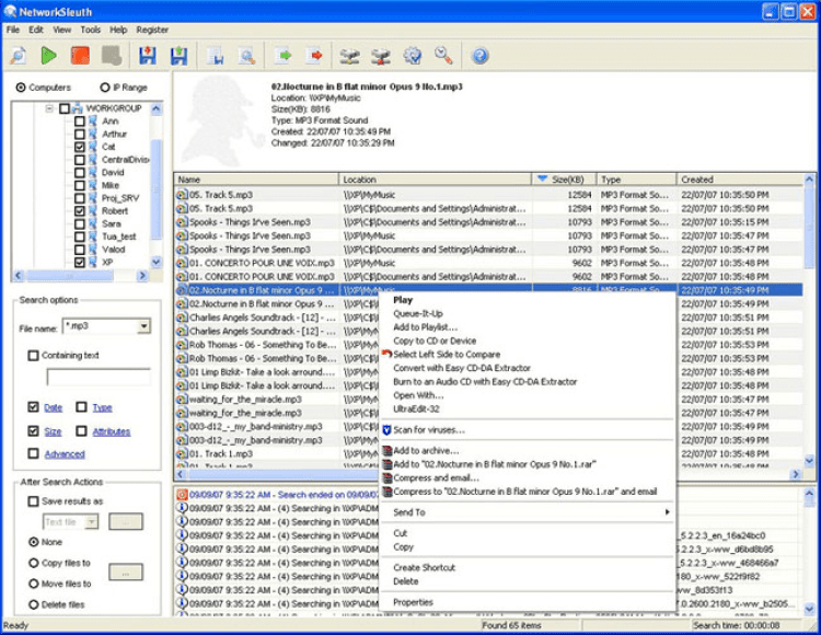 NetworkSleuth - это поисковая утилита, которая поможет быстро найти нужный файл в локальной сети. Позволяет вести поиск файла по имени или его типу. NetworkSleuth может сканировать скрытые директории и автоматически логиниться в защищеные директории, используя заранее заданные логин и пароль.