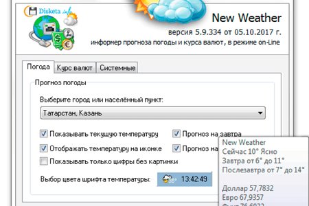 New Weather - программа для получения прогноза погоды для выбранного города и курса иностранных валют, в режиме On-Line через Интернет. Информер находится в системной панели возле часиков и при наведении курсора мышки показывает информацию более подробно. Так же можно включить отображение индикатора погоды на рабочем столе, при этом картинка индикатора будет соответствовать текущей погоде! Погода практически для всех населённых пунктов России 25311(в том числе и Крыма), текущий прогноз, на завтра и послезавтра!