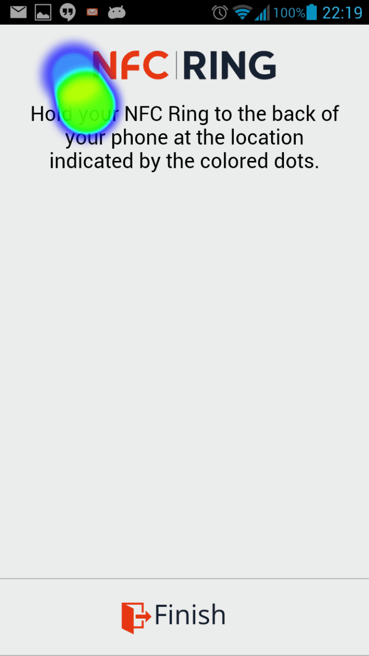 Для считывания или записи информации на NFC Ring, включите NFC на своём смартфоне и поднесите кольцо к задней панели своего смартфона в области, отмеченной на экране цветной точкой.