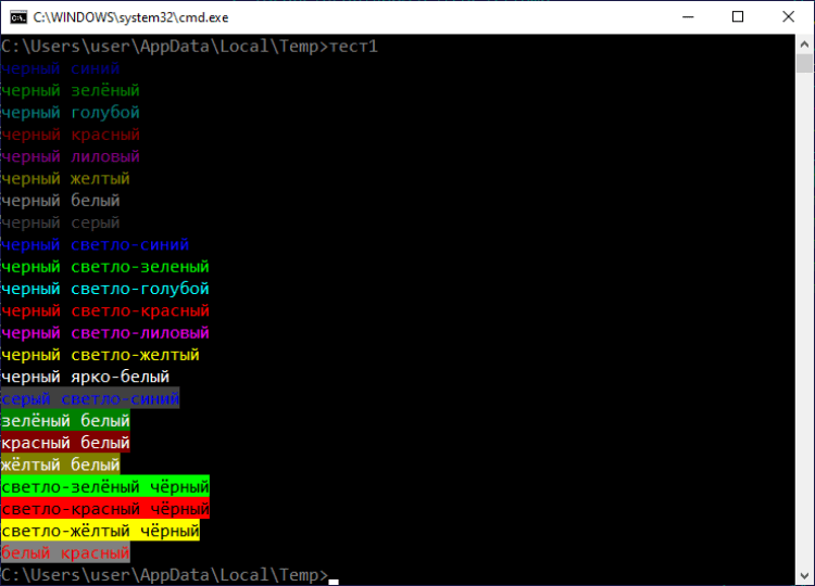 Программа поддерживает 16 цветов, аналогично команде color в Windows: