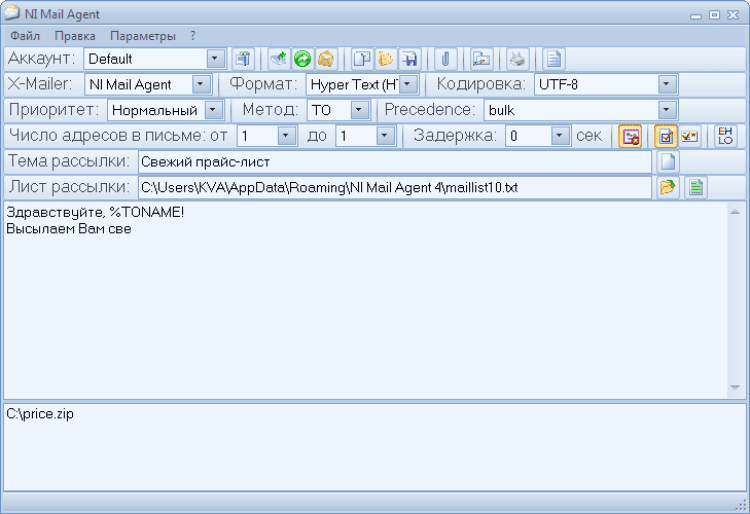 NI Mail Agent - это программа для массовой рассылки почты с поддержкой socks-прокси и шаблонов автозамены текста. Можно рассылать как обычные письма, так и письма в формате HTML, а также прикреплять к письмам файлы. Рекомендуется для рассылки прайсов, новостей, приглашений и т.д.