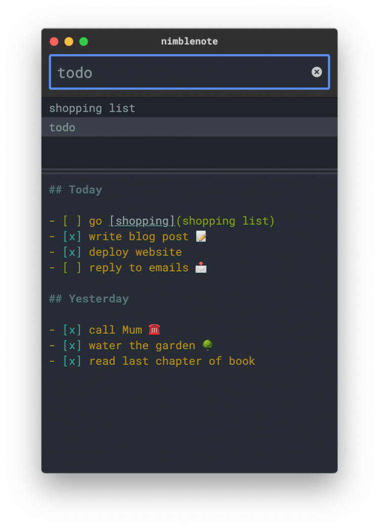 nimblenote — это приложение для macOS, предназначенное для быстрой записи информации, и хранения заметок. От других менеджеров заметок его отличает полное отсутствие каких-либо функций и опций. Тем не менее оно позволяет эффективно записывать любую информацию и управлять записями.