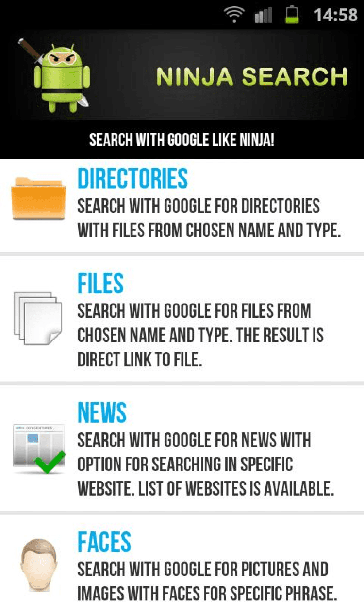 Ninja Search Приложение, предоставляющее вашему мобильному устройству быстрый и точный поиск с Google для: