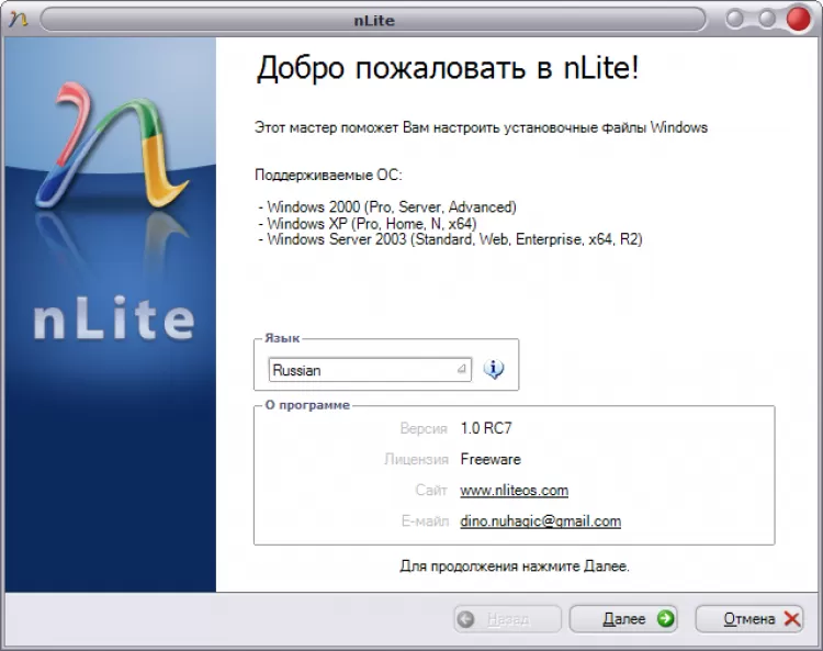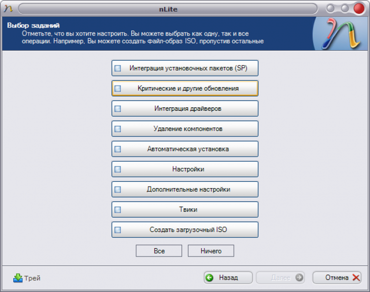 nLite - это программа, которая позволяет создавать свои версии ("сборки") операционной системы Windows. nLite позволяет добавлять в образ системы драйвера устройств, обновления системы, темы оформления, а также проводить тонкую настройку системы. Поддерживаются 32 и 64 битные версии системы.