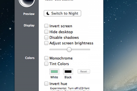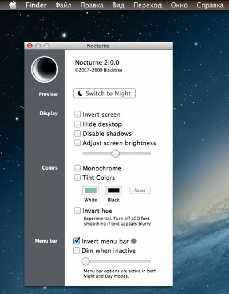 Nocturne Небольшая утилита, которая поможет изменить цвет строки меню на черный. Помимо этого Nocturne умеет переключать Мак в "ночной" режим и уменьшать яркость дисплея. Эта функция особенно понравится тем, кому часто приходится работать по ночам или в темных помещениях. Также можно отключить тени, отбрасываемые окнами, чтобы немного увеличить скорость работы системы.