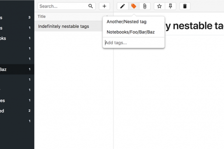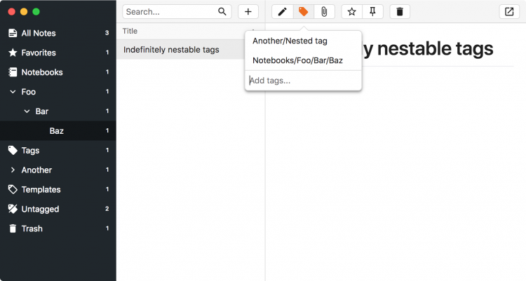 Помимо блокнотов, приложение использует теги для управления заметкам. Поддерживаются многоуровневые теги.
