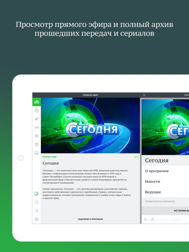 Телеканал НТВ: новости, видео, передачи, сериалы и кинофильмы — это приложение позволит вам смотреть прямой эфир телеканала НТВ и полные выпуски и архив всех передач, которые когда-либо были показаны на телеэкране, прямо на экране своего мобильного устройства. Благодаря этому приложению, вы сможете смотреть любимые телепередачи и сериалы, читать актуальные новости, просматривать телепрограмму, фотогалерею по актуальным событиям, сохранять важные новости и видео в списке избранного, для получения доступа к ним без подключения к интернету, а так же делиться новостями с друзьями и транслировать видео через AirPlay и Google Chromecast.