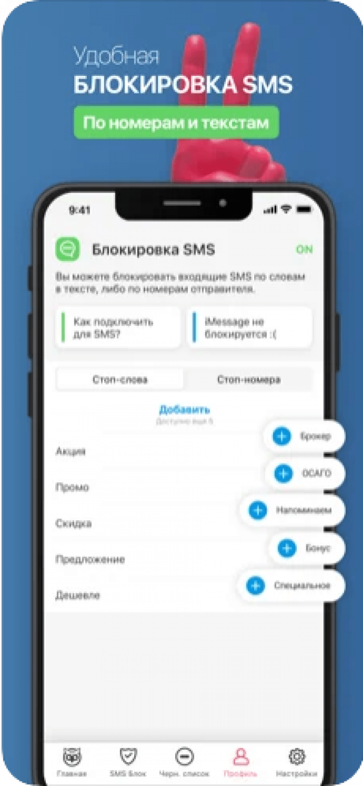 - Блокировка СМС по номерам или тексту.