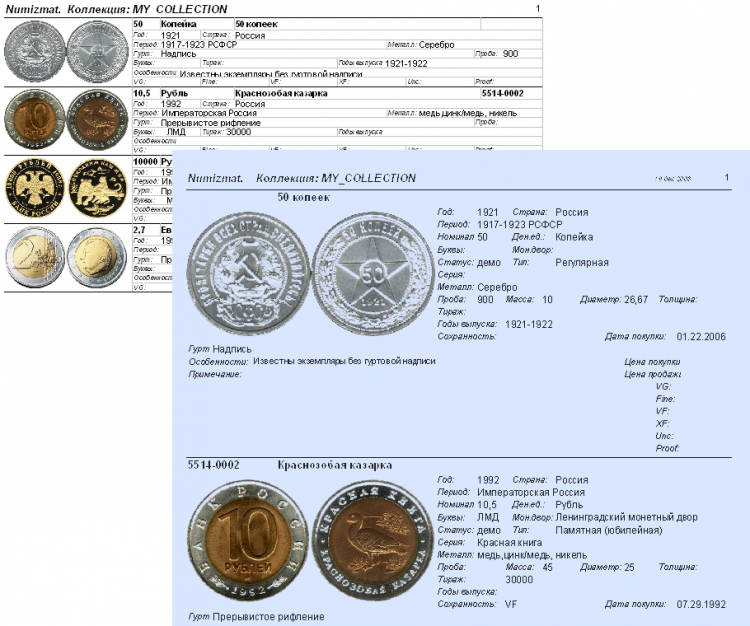 - Возможность составления каталога (монеты со статусом «демо»). Цены VG, Fine, VF, XF, Unc, Proof и другие;