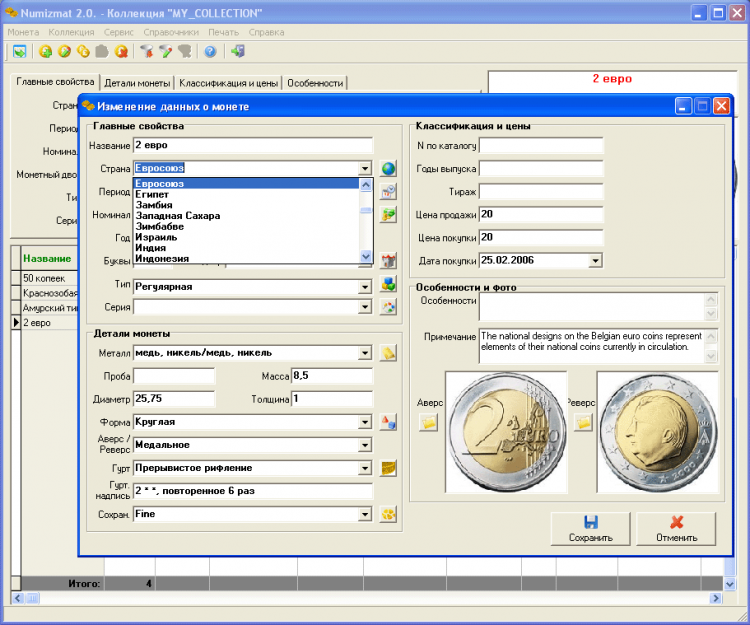 Numizmat - это программа предназначена для составления электронной копии Вашей коллекции монет. Интерфейс программы интуитивно понятен и мультиязычен!