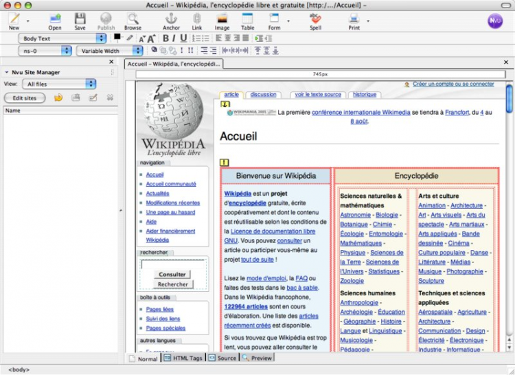 Nvu - это WYSIWYG HTML-редактор, основанный на компоненте Composer пакета Mozilla Application Suite. Предоставляет полный инструментарий, необходимый для создания веб-страниц с любмы содержанием. Прост в использовании благодаря возможности визуального редактирования.