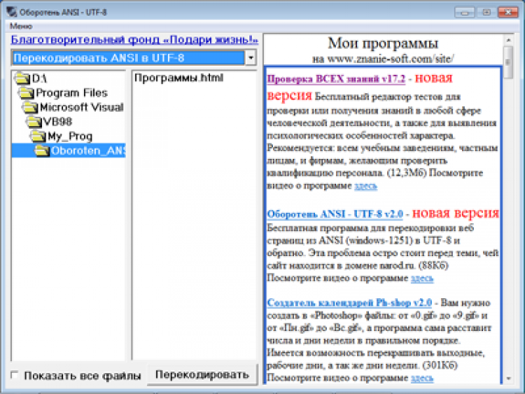 Оборотень ANSI - UTF-8 - это бесплатная программа для перекодировки веб страниц из ANSI (windows-1251) в UTF-8 и обратно. Эта проблема остро стоит перед теми, чей сайт находится в домене narod.ru. Данную программу Вы можете скачать бесплатно на нашем сайте