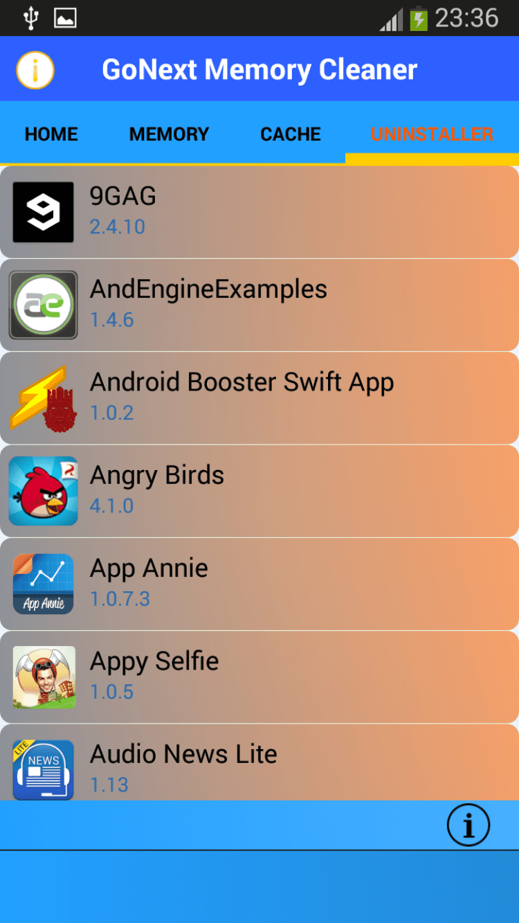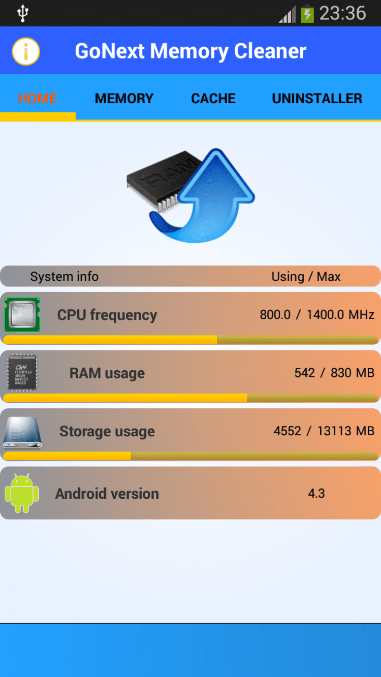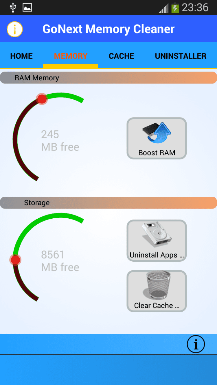 Очиститель памяти Go Next! - это программа для очистки кэша и оперативной памяти вашего устройства. Memory Cleaner Go Next! позволит вам ускорить работу системы, очистив кэш приложений, а так же отобразит объемы использованной и освобожденной памяти. Чистку можно делать тогда, когда потребуется.