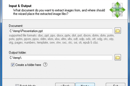 Office Image Extraction Wizard - это приложение для сохранения изображений из офисных документов. Так же вы сможете извлекать изображения из электронных книг. Изображения сохраняются в оригинальном формате, таким образом качество не будет потеряно. Для работы не требует MS Office. Список поддерживаемых форматов: * Microsoft Office 97 / 2000 / XP / 2003 Word ( .doc | .dot ) - PowerPoint ( .ppt | .pot | .pps ) * Microsoft Office 2007 / 2010 / 2012 - Word ( .docx | .docm | .dotm | .dotx ) - PowerPoint ( .pptx | .ppsm | .potm | .potx | .pptm | .ppsx | .sldm ); - Excel ( .xlsx | .xlsm | .xltm | .xltx ) * OpenOffice / Libre Office / StarOffice - Writer ( .odt | .ott ) - Impress ( .odp | .otp ) - Calc ( .ods | .ots ) - Draw ( .odg | .otg ) * NeoOffice / Old OpenDocument Format - Text ( .sxw | .stw ) - Presentation ( .sxi | .sti ) - Spreadsheet ( .sxc | .stc ) * Apple iWorks - Pages ( .pages | .template ) - Numbers ( .numbers | .template ) - Microsoft XML Paper Specification ( .xps ) - Open XML Paper Specification ( .oxps ) - Microsoft Compiled HTML Help ( .chm ) New! - Electronic Publication Books ( .epub ) - Fictionbook ( .fb2 ) - Comic Book Archive ( .cbz ) - Autodesk AutoCAD DWFX ( .dwfx ) - Adobe Shockwave Flash ( .swf )