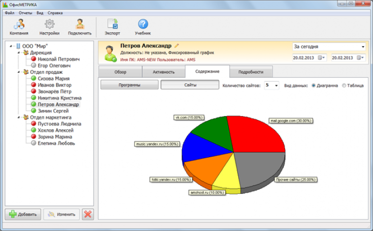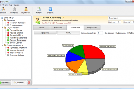 Наглядные таблицы и диаграммы быстро дадут ответ на вопрос, сколько времени сотрудник занимался работой, а сколько - личными делами. ОфисМЕТРИКА отличается высокой степенью безопасности, потому что все данные об активности сотрудников остаются только в пределах вашей локальной сети и никогда не передаются через Интернет. Более того, программа НЕ записывает никакой конфиденциальной информации (переписки, вводов паролей и т.п.), поэтому не нарушает права сотрудников.