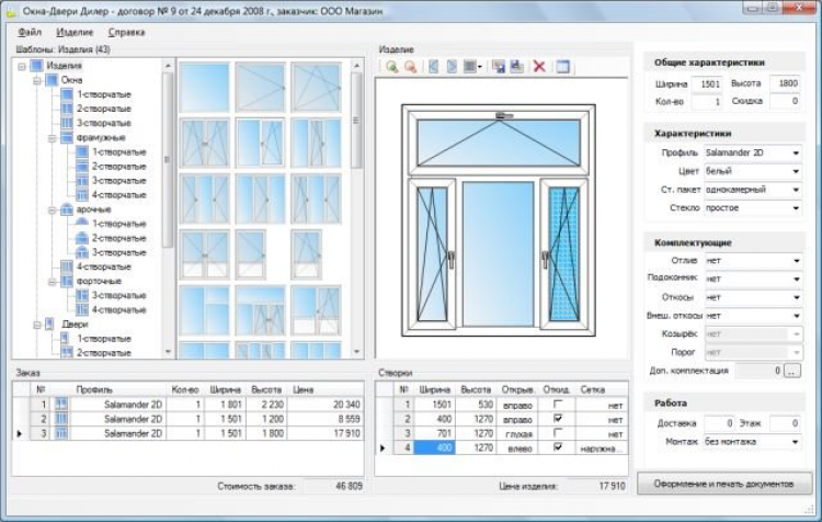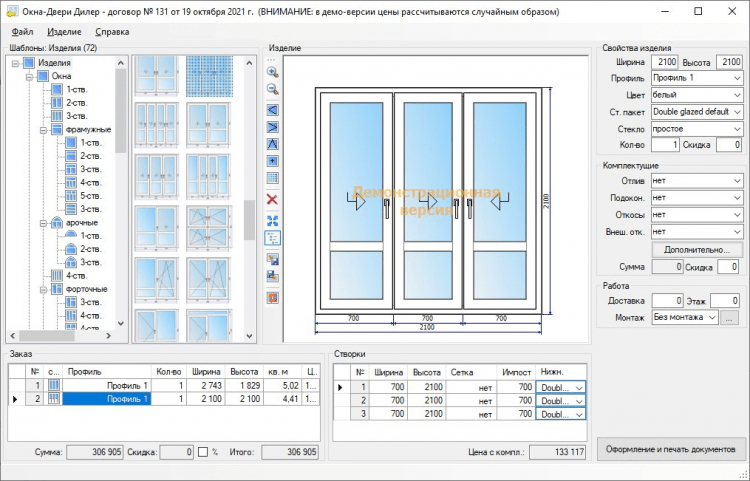 Программа автоматически подготовит договор, приложение к договору (включающее эскизы изделий и подробный перечень аксессуаров и доп. комплектации), заявку в производство (с размерами заготовок профиля, стеклопакетов). В один заказ можно включать рассчитывает изделия с разной комплектацией, подоконниками, отливами, доставкой, монтажом и так далее.