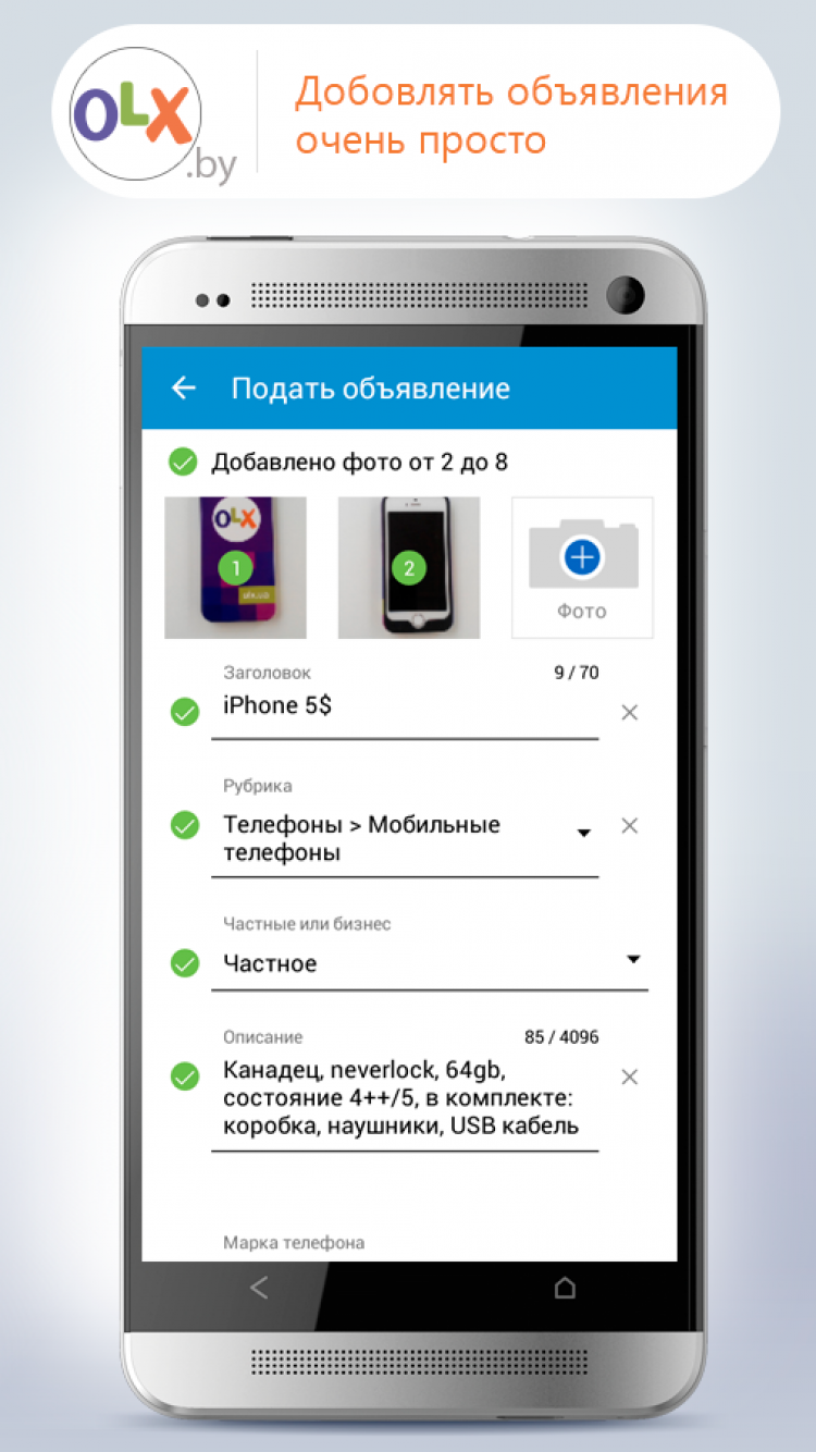 Подать новое объявление в OLX.by Бесплатные Объявления также необычайно просто. Напишите описание товара, сфотографируйте его при помощи камеры своего гаджета и опубликуйте объявление, после чего останется только ждать звонка покупателя или вопросов, поступающих прямо через приложение. Вы также можете заказать различные платные услуги, которые помогут продать товар быстрее.
