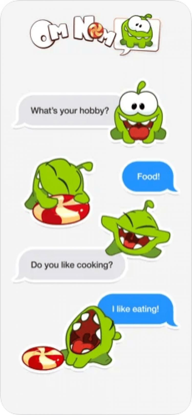 Om Nom Stickers — это программа для любителей серии игр Cut the Rope. Она поможет сделать ваше общение с друзьями в iMessage ещё интереснее и приятнее, при помощи красочных стикеров с вашим любимым Ом Номом.