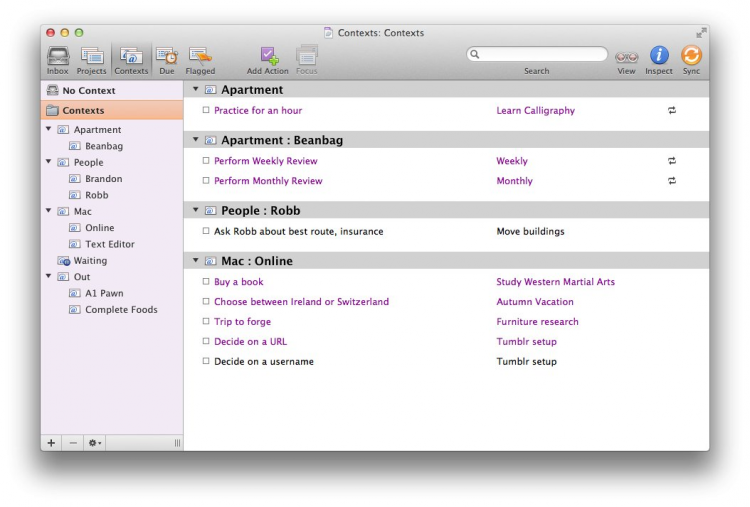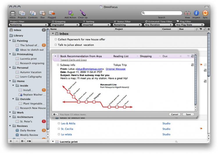 OmniFocus - ваш личный менеджер задач. Позволяет организовывать списки дел в удобном виде и сосредотачиваться на самых важны и актуальных делах. Задачи можно делить на катеогрии, колличество которых неограниченно, сортировать, фильтровать по различным критериям, искать их. А чтобы список дел всегда был под рукой, есть возможность синхронизации между несколькими компьютерами и мобильными устройствами.