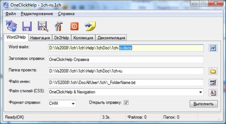 OneClickHelp - это программа позволяет создавать привычный документ в MS Word и за один клик получать Справку Chm, HxS, Aspx, Html со структурой и форматированием как у вас в документе. Вы можете добавить дополнительные элементы - навигацию, колонтитул, и пр. Преобразование может быть выполнено через интерфейс, так и через командную строку. Таким образом, один документ является и печатной документацией и электронной справкой и частью сайта. OneClickHelp это набор программ, с одним окном и 5 закладками, по числу программ.