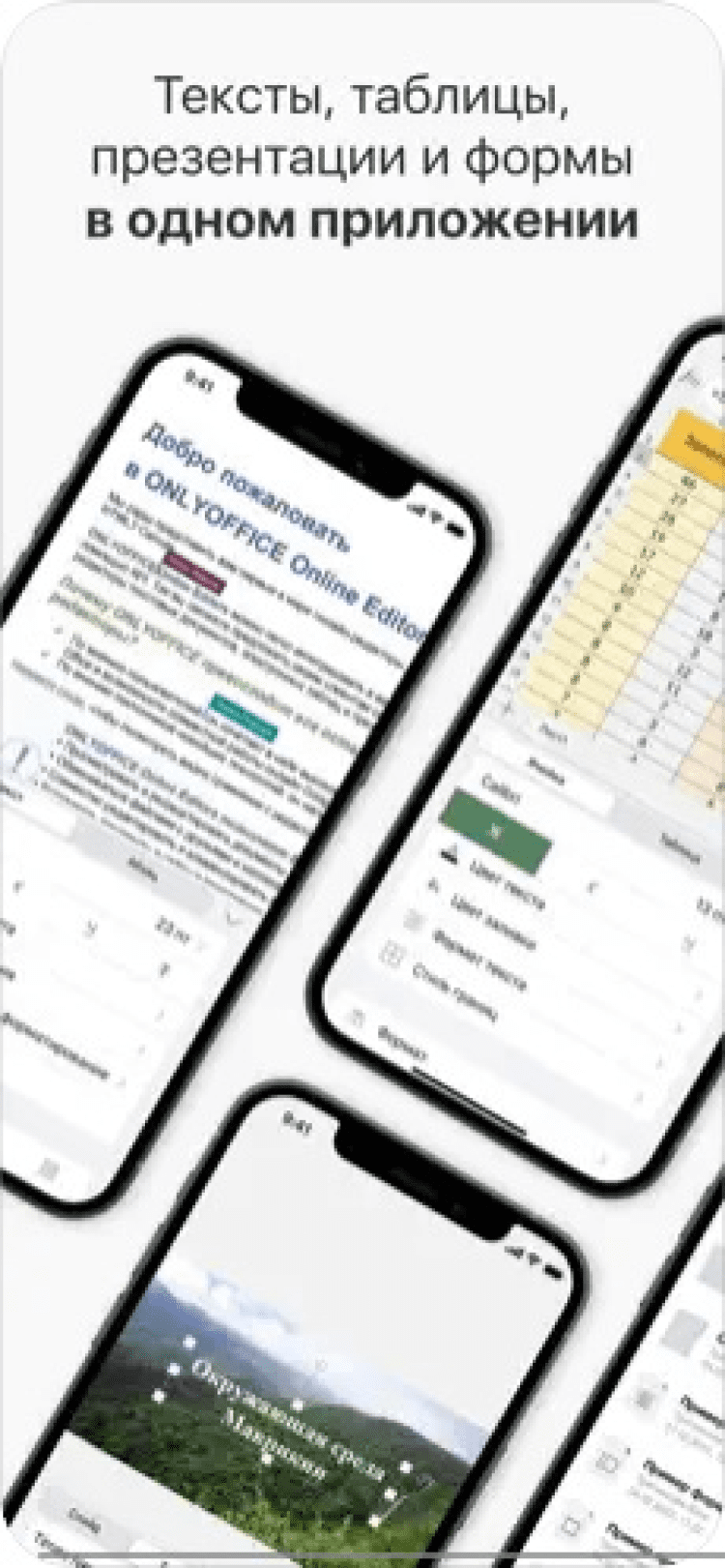 ONLYOFFICE Документы ONLYOFFICE Документы - это бесплатное офисное приложение для устройств на базе iOS, позволяющее работать с текстовыми документами, электронными таблицами и презентациями в любое время и в любом месте. Включает в себя текстовый редактор и редактор электронных таблиц, а также программы для просмотра презентаций и pdf файлов. Открывает файлы любого размера и сложности без искажений и потери форматирования.