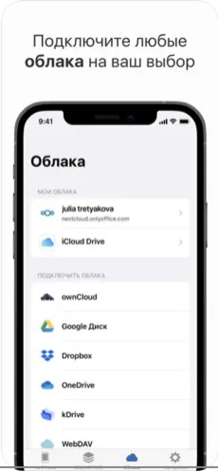 Благодаря возможности подключения к популярным облачным сервисам, таким как Google Drive, Dropbox, Box, SharePoint, Яндекс.Диск, ownCloud или к любым другим cloud-хранилищам с поддержкой протокола WebDAV, все необходимые документы хранятся в одном месте.