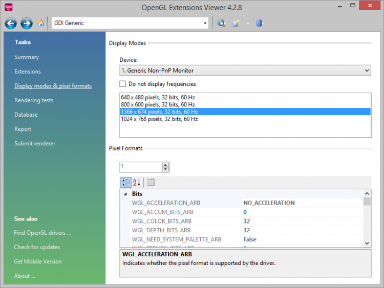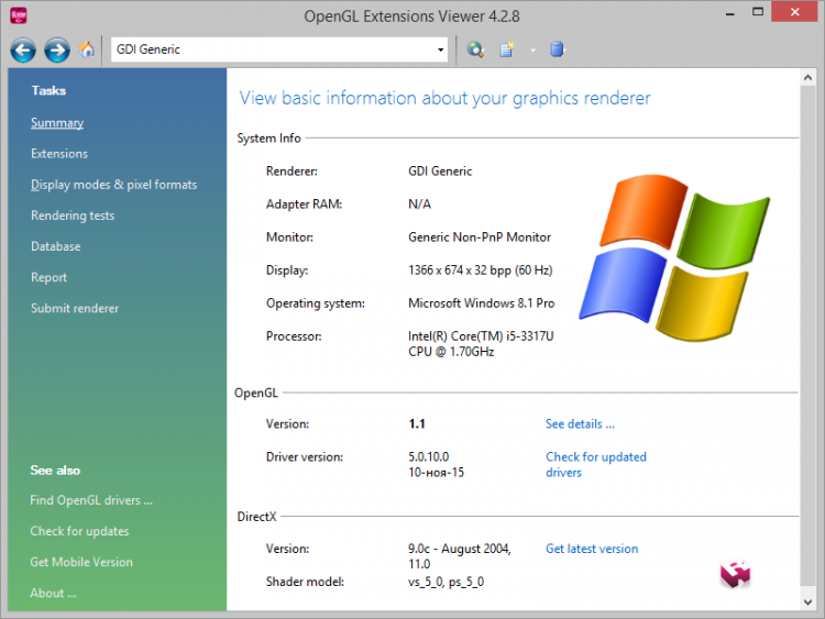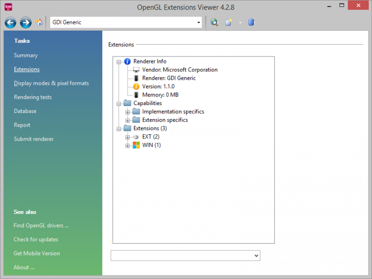 OpenGL Extensions Viewer Надежная универсальная программа, которая отображает полезную информацию о вашем OpenGL 3D акселераторе, включая производителя, марку, версию ускорителя, а также расширения OpenGL.