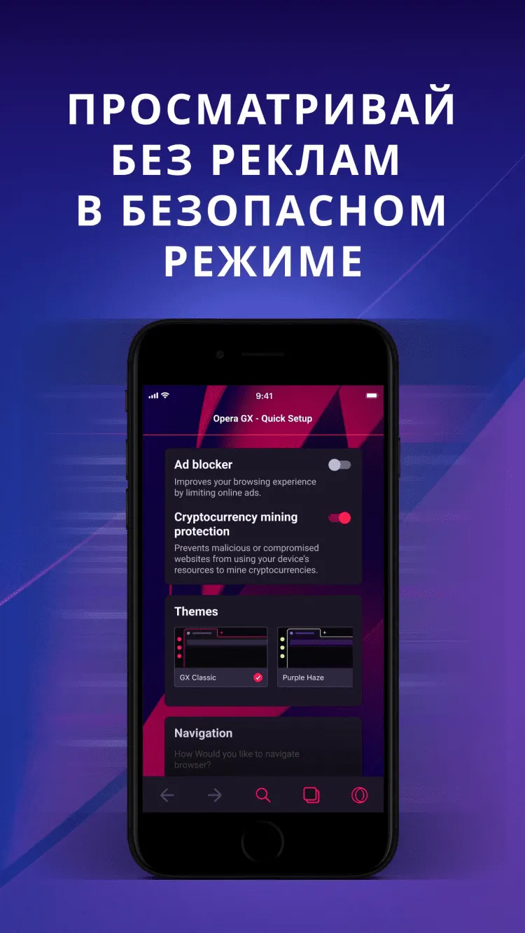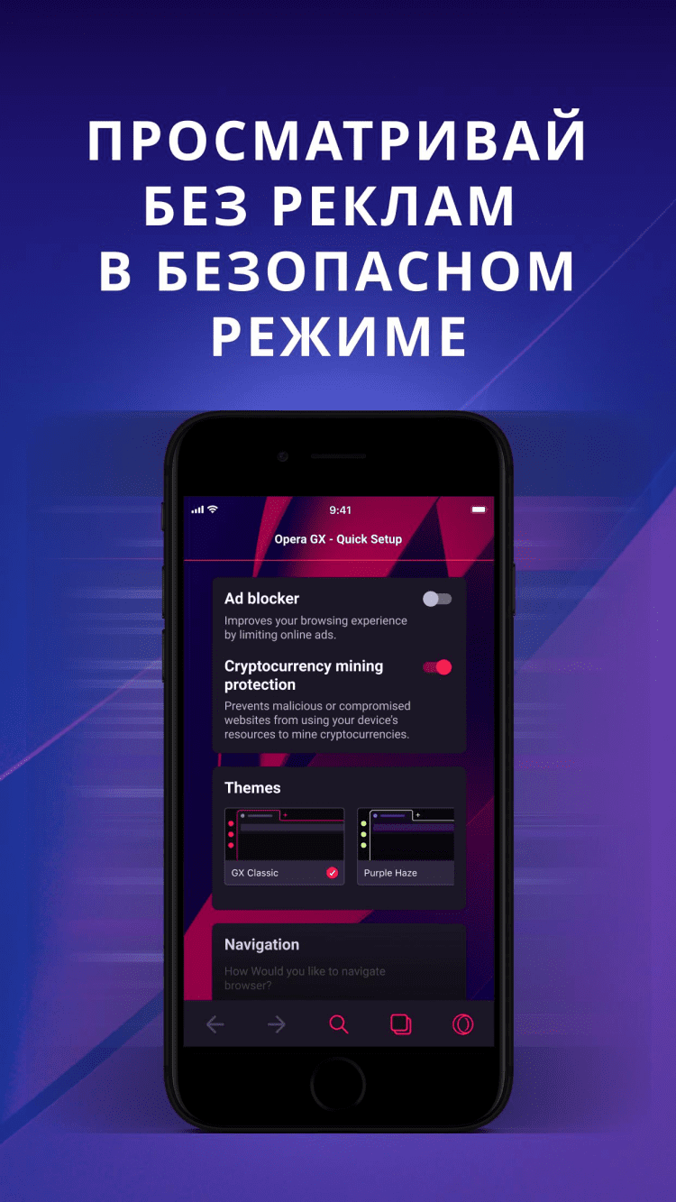 На этом возможности программы не заканчиваются. В остальном, перед вами всё тот же привычный браузер Opera, который обеспечивает высокую скорость загрузки страниц и надежную защиту данных. В настройках приложения, вы можете активировать встроенный блокировщик рекламы и защиту от майнинга, а также функцию блокировки запросов о сборе cookies и всплывающих окон. Там же, пользователь может выбрать способ управления браузером: при помощи привычных кнопок в нижней части экрана, либо с использованием кнопки быстрого действия, как в браузере Opera Touch.
