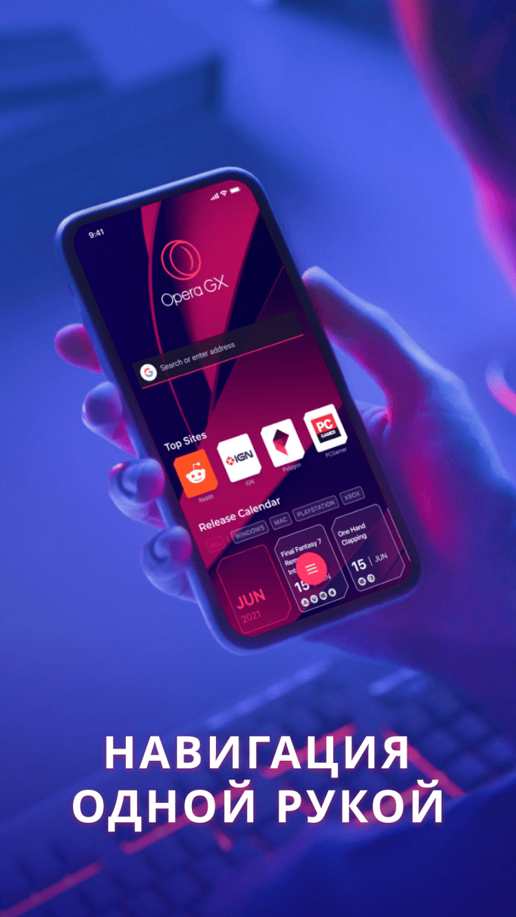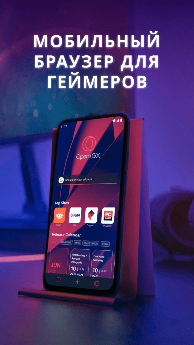 Программа Opera GX была специально разработана для любителей компьютерных игр. Мобильная версия браузера не стала исключением. На стартовом экране приложения, вы найдёте всю необходимую информацию: календарь выпусков долгожданных новинок, с выбором платформы, бесплатные раздачи игр, новости, анонсы и многое другое. Там де, расположена привычная поисковая строка и закладки, для быстрого перехода на YouTube, Twitch, или Reddit.