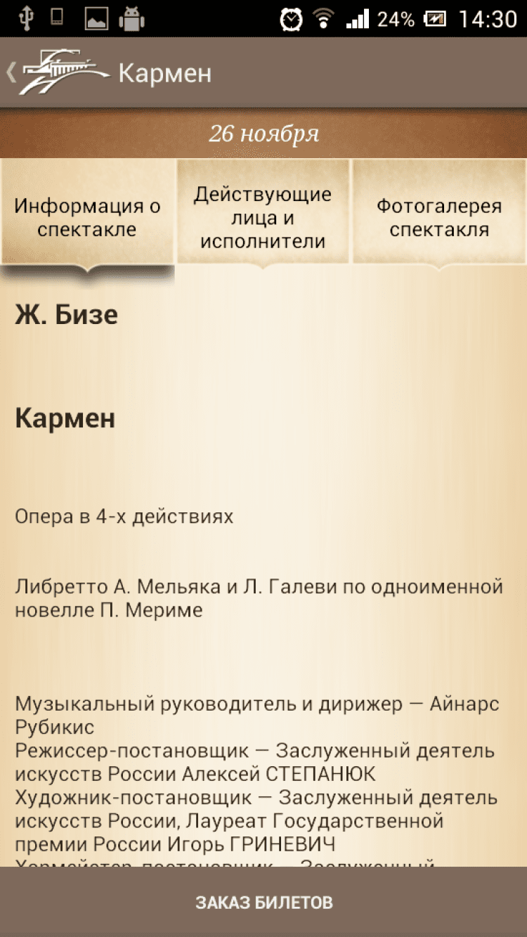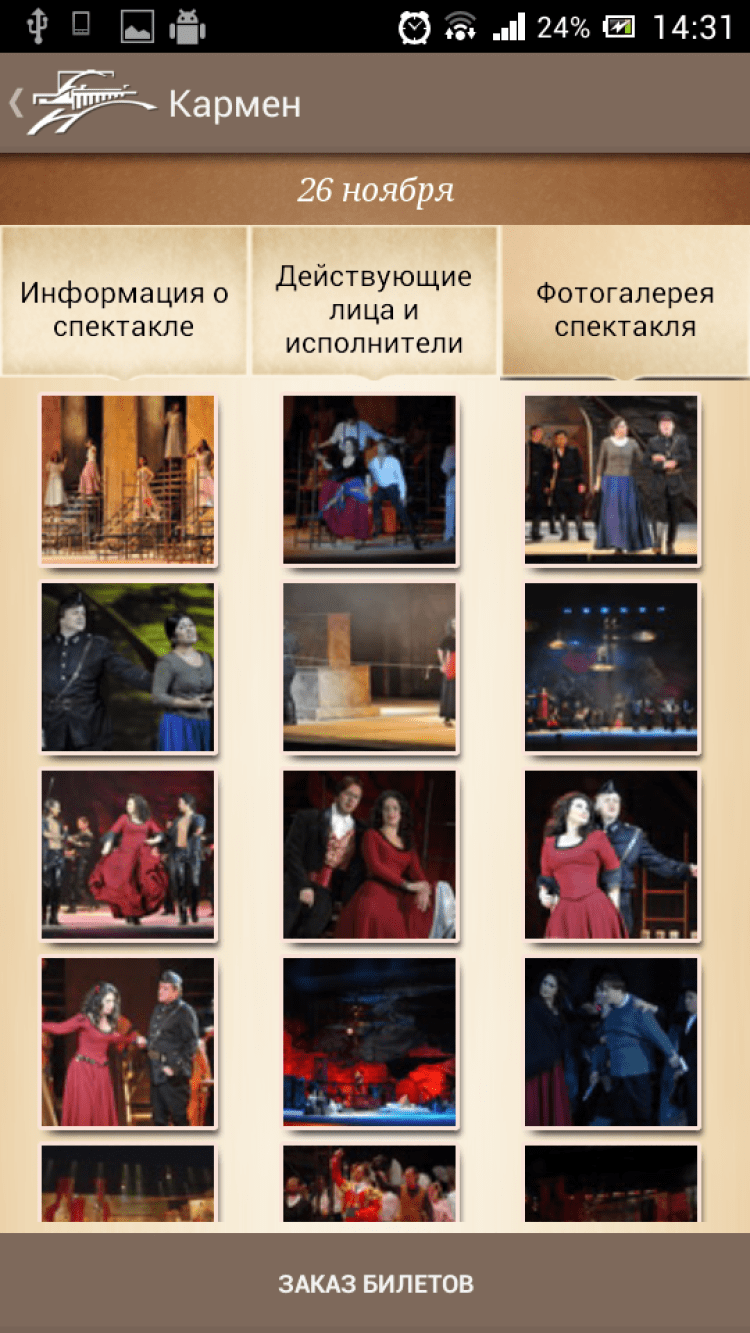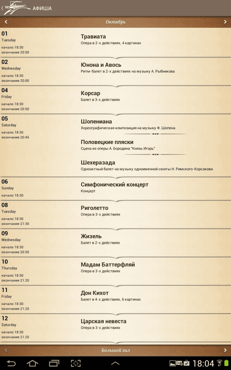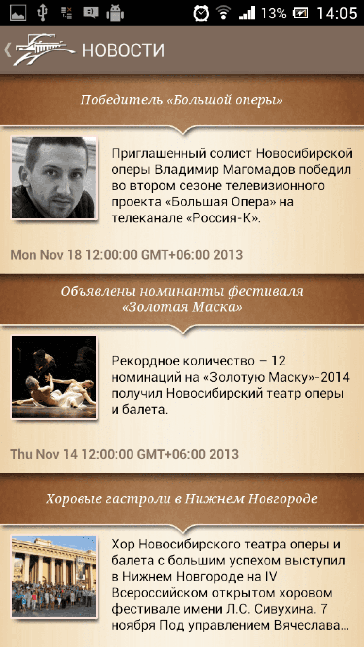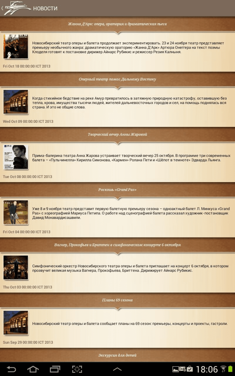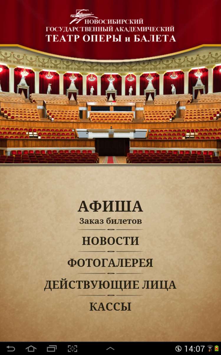 Опера и Балет Приложение, которое позволит вам просматривать новости и афишу Новосибирского Государственного Академического театра Оперы и Балета. Узнавайте подробную информацию о каждом предстоящем мероприятии и приобретайте билеты на них онлайн, а так же просматривайте фотогалереи, посвященные различным постановкам.