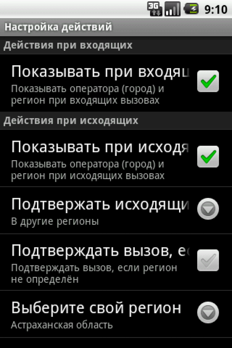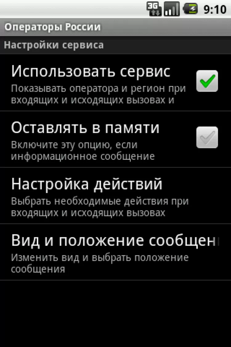 - определение оператора (города) и региона при входящих и исходящих вызовах (с возможностью отключения данной функции);